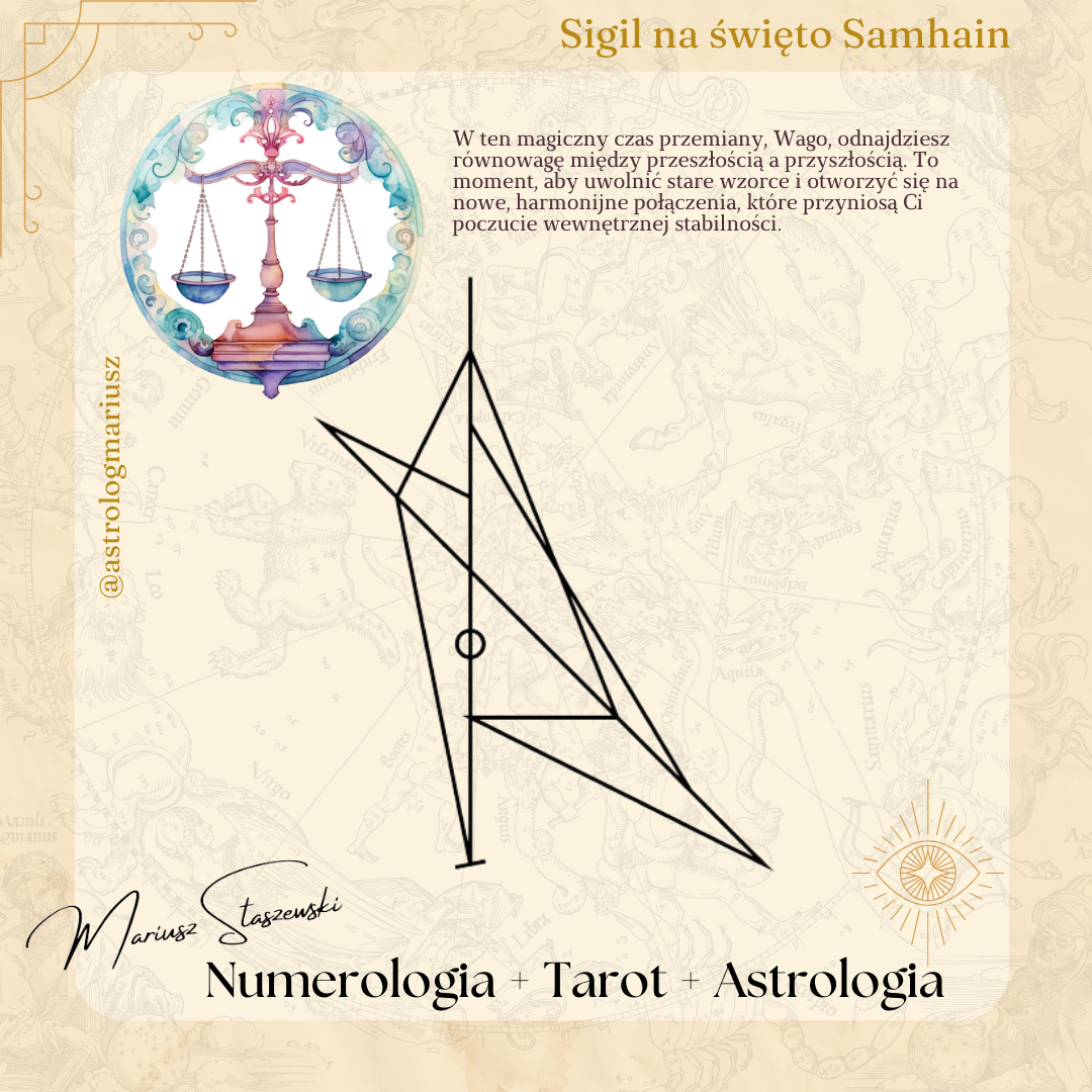 ⚖️ Samhain i Równowaga Wagi ⚖️Samhain przynosi Ci, Wago, czas na osiągnięcie harmonii między przeszłością a przyszłością. To moment na zrównoważenie energii, uwolnienie starych wzorców i stworzenie przestrzeni dla nowych, harmonijnych połączeń. Jak użyć sigila: Skup się na sigilu, wyobrażając sobie równowagę w swoim życiu. Umieść go w miejscu, gdzie codziennie przebywasz, aby wspierał proces równoważenia energii.