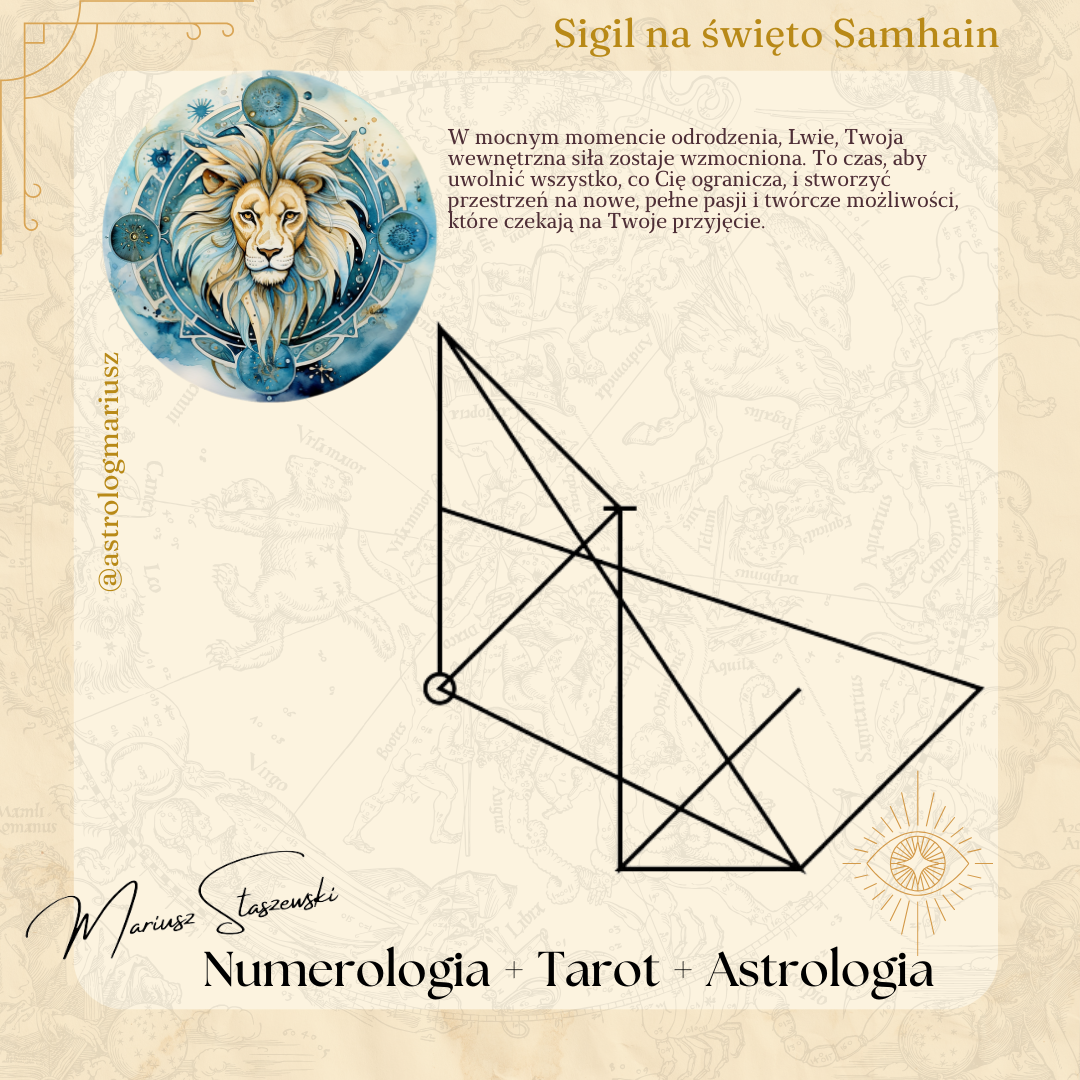 🔥 Samhain i Ogień Lwa 🔥Samhain rozbudza w Tobie siłę ognia i determinację do uwolnienia tego, co Cię ogranicza. To czas, by spalić przeszłość i stworzyć miejsce na nowe, potężne możliwości. Jak użyć sigila: Skup się na sigilu, wizualizując transformację przez ogień. Zapisz swoje intencje na kartce i spal ją razem z sigilem, aby uwolnić się od tego, co już nie służy.